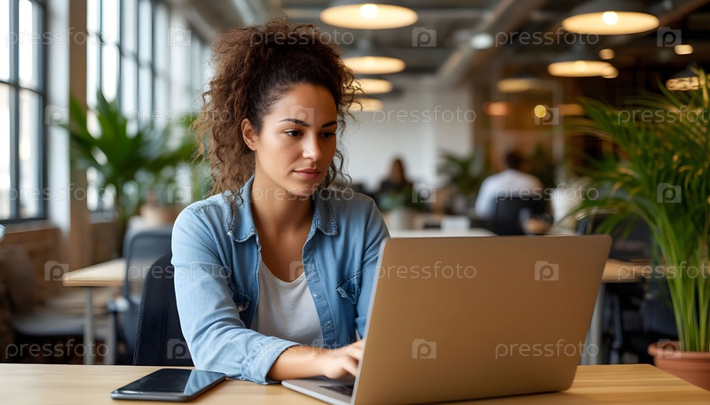 Фотореалистичное изображение женщины с ноутбуком в коворкинге