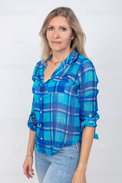 Красивая блондинка средних лет со стройной фигурой в повседневной одежде, рубашке и джинсах