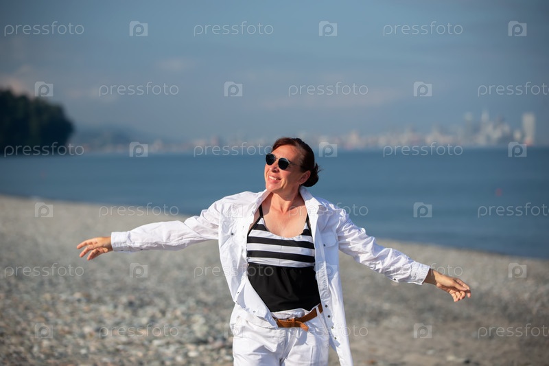 Женщина в белой рубашке гуляет по берегу моря