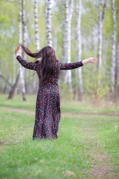 Женщина с длинными черными волосами гуляет по березовой роще спиной к камере