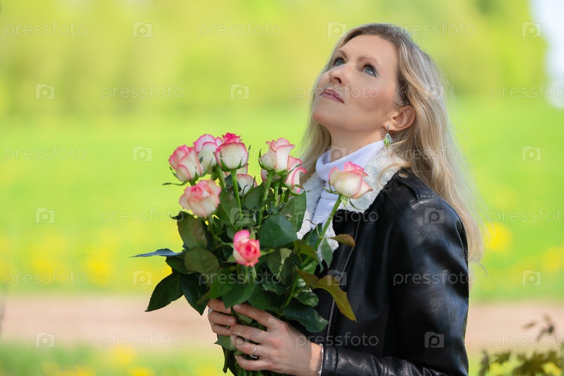 Счастливая взрослая блондинка с букетом роз на естественном фоне