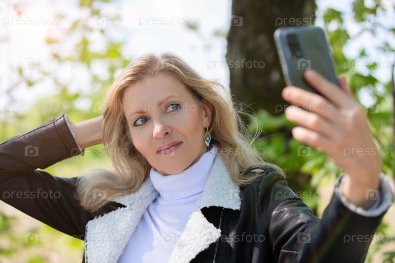 Привлекательная блондинка взрослая женщина делает селфи среди весенней природы