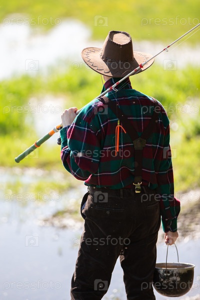 Взрослый мужчина с удочкой идет на рыбалку