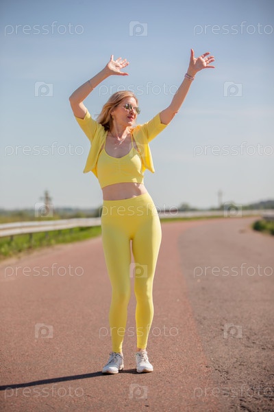 Спортивная взрослая женщина в желтой одежде машет руками