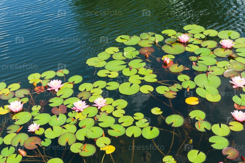 Поверхность пруда с розовыми водяными лилиями