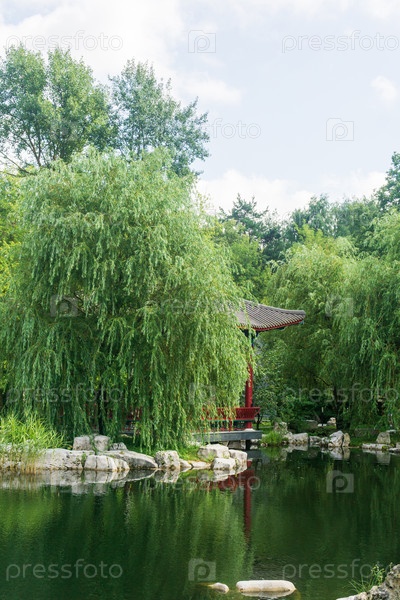 Красивый пейзаж восточного сада с прудом и беседкой среди листьев, вертикальная рама