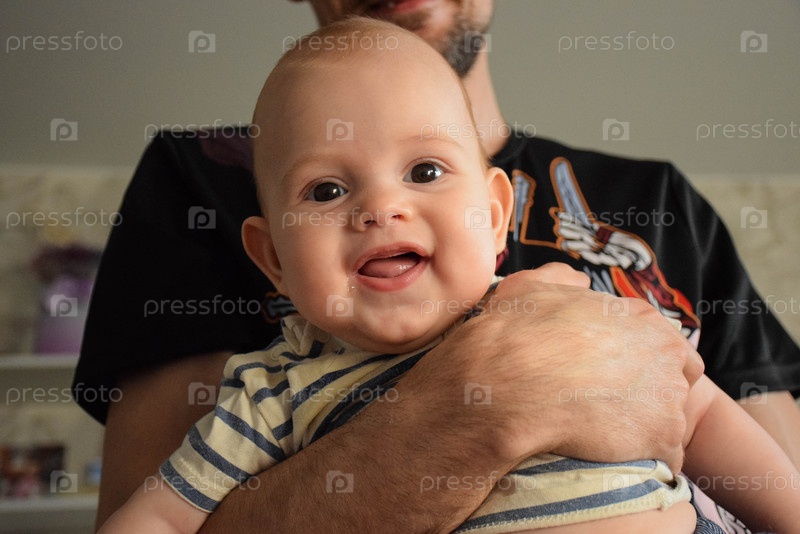 малыш смеется на руках у папы
