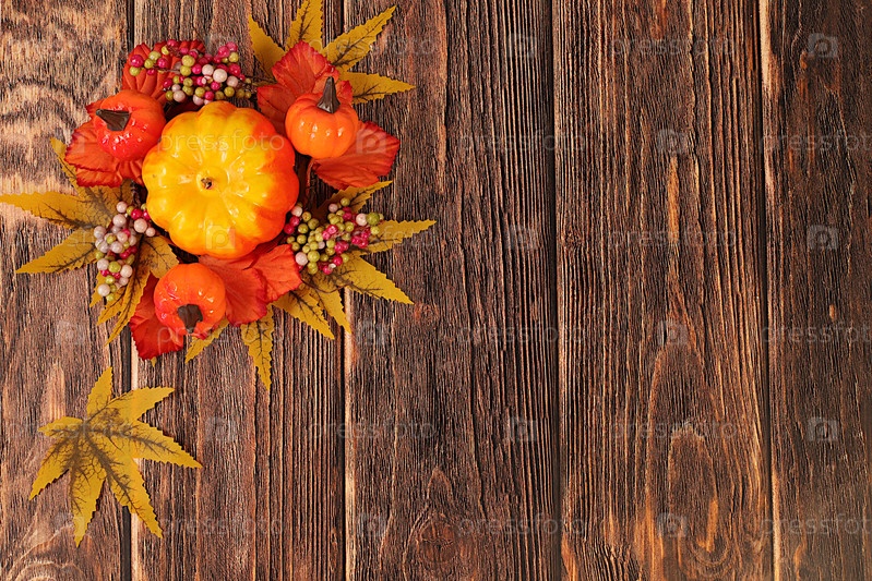 Баннер Дня благодарения, осенний фон с венок кленовых листьев, красная зола, тыква на старом деревянном столе, креативный шаблон дизайна с текстовым пространством на экране, концепция урожая,