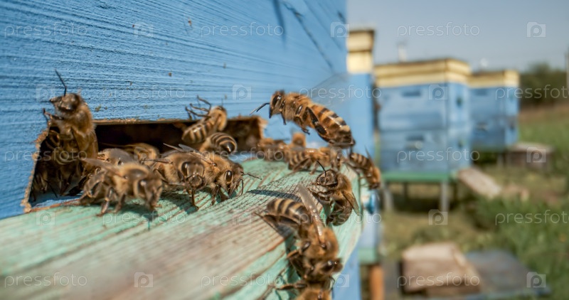 Медоносные пчелы летают вблизи улья. Пчёлы наиболее известны людям своей экологической ролью опылителей