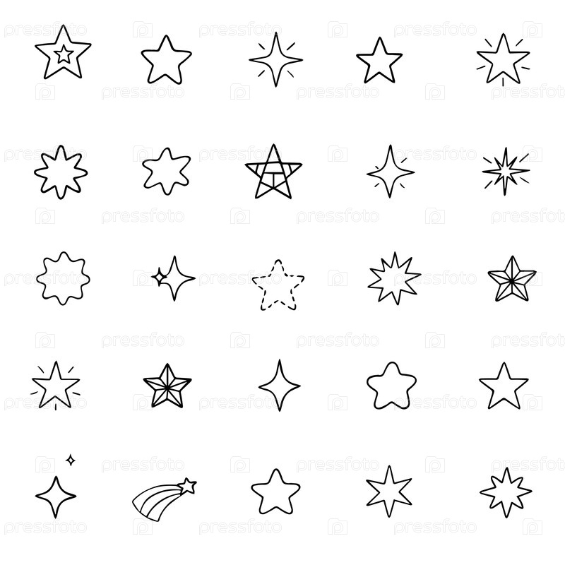 The Doodle Star Icon Collection. Различные звездные формы. Набор черных звёзд, нарисованный вручную. Падающие звезды. Векторная иллюстрация. Иллюстрация вектора