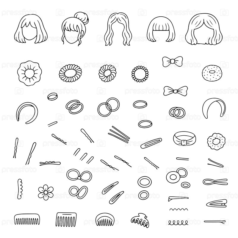 Черно-белая векторная иллюстрация, изображающая различные аксессуары для волос, включая головные повязки, скрунчи, клипы, гребли и колпачки. идеально подходит для дизайна красоты и моды
