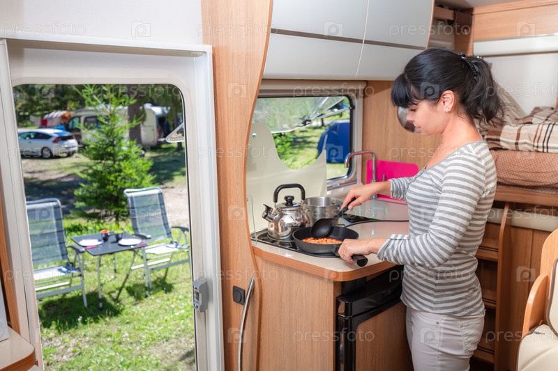Женщина готовит в трейлере, RV интерьер рома