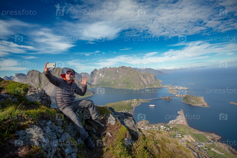 Удивительный пейзаж Лофотенских островов с вершины горы Рейнбриген с синим небом, округ Нордланд, Норвегия