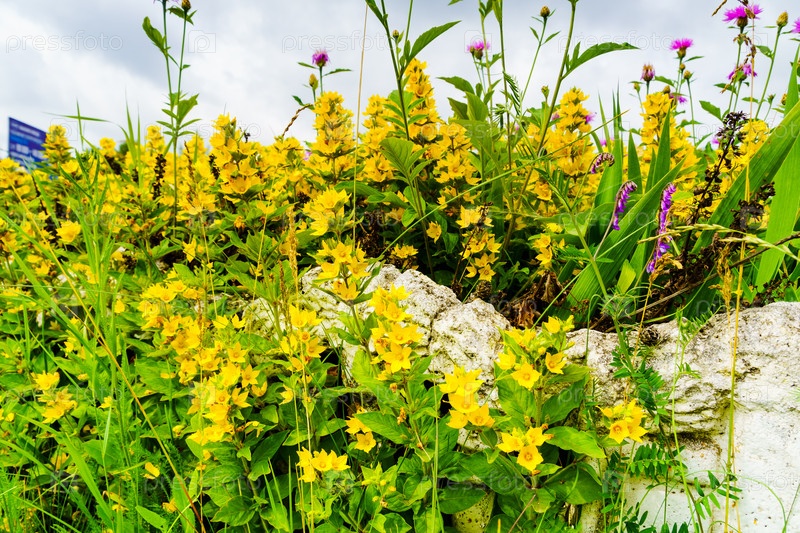 Сельский ландшафт. Цветочный клумб с обычным вербеином. с. Измальково. Липецкая область