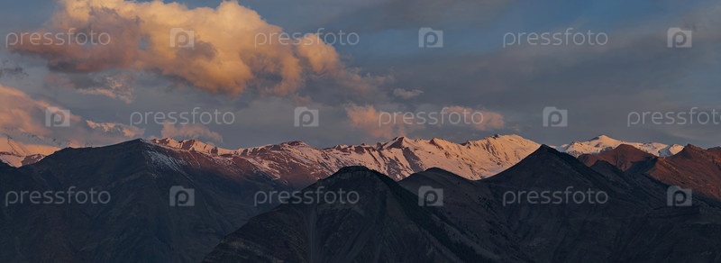 Россия. Северо-Восточный Кавказ, Республика Дагестан. Покрытые облаками и освещенные утренним солнцем, заснеженные горные вершины возле города Агвали
