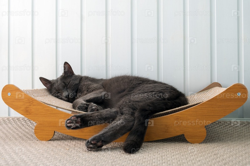 Спящий кот отдыхает в деревянной кроватке