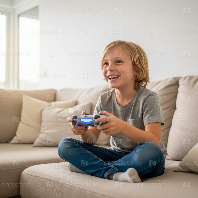 Счастливый ребенок играет в видеоигры на диване Generated AI