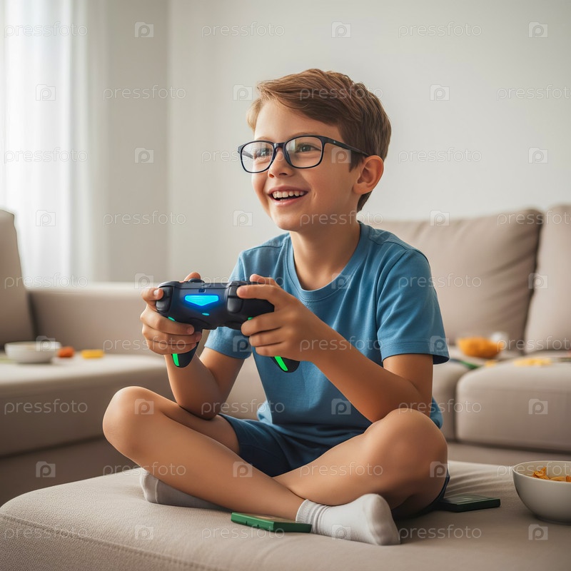 Счастливый ребенок играет в видеоигры на диване Generated AI