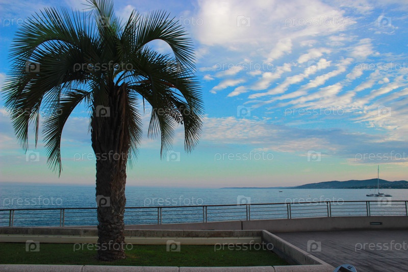Пальмовый и вечерний морской пейзаж на лазурном побережье Франции