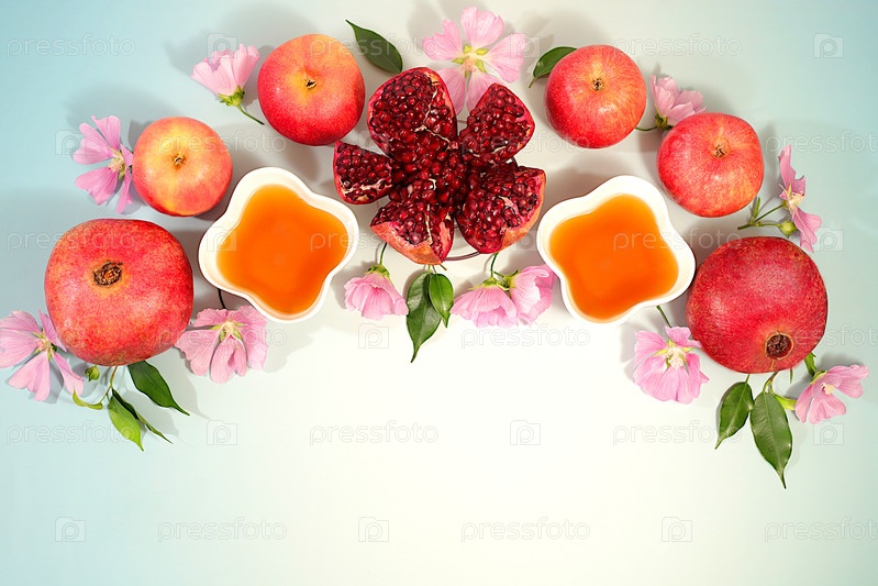 Осенний фон и рекламный баннер с символами еврейского Нового года, шаблон с медом, яблоками, гранатом и цветами