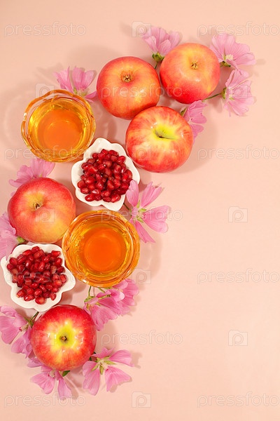 Осенний фон с медом, яблоками, гранатом и цветами, рекламный баннер с символами еврейского Нового года, творческая композиция для поздравления с еврейским праздником Ро Хашан,