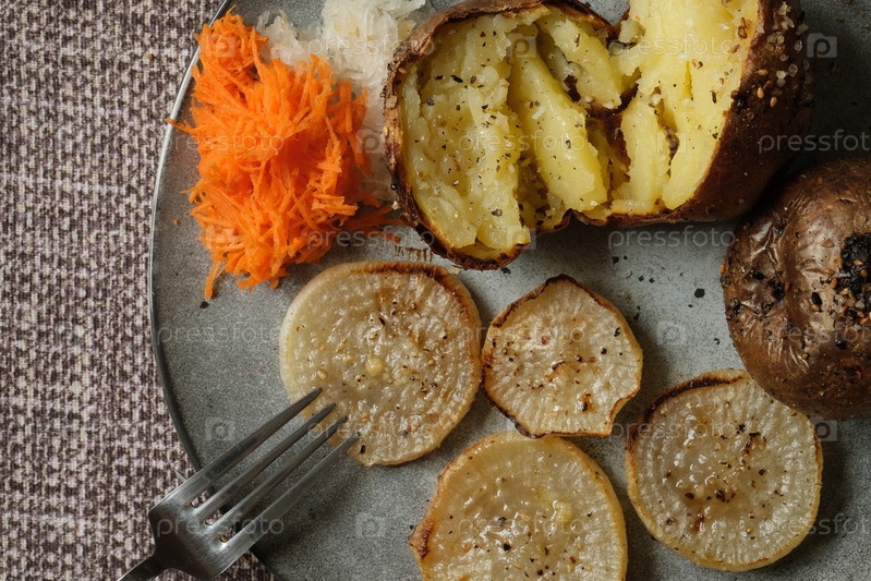 Запеченный картофель Куртка из картофеля с редисом и овощами, подается на тарелке
