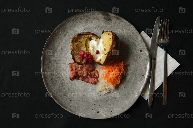 Запеченные картофели с сметаной, беконом и овощами подаются на тарелке