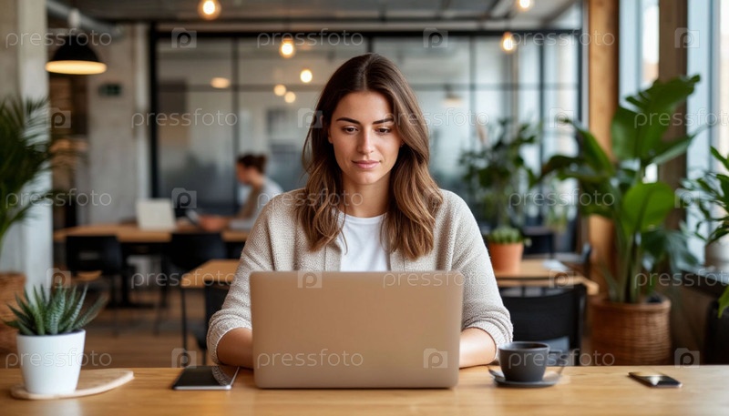 Фотореалистичное изображение женщины с ноутбуком в коворкинге