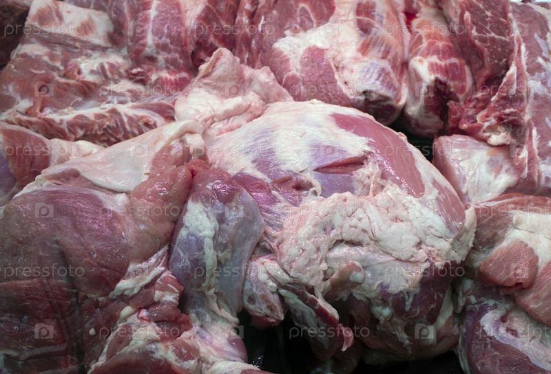Сырое свежее красное мясо лежит в мясном отделе магазина и на рынке