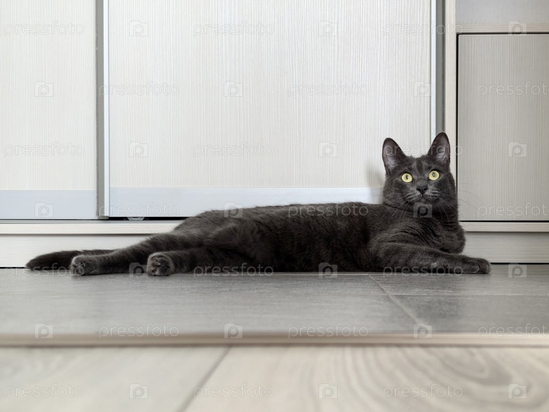 Серый кот лежит на полу с любопытным выражением лица