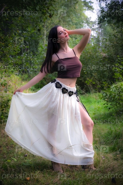 Красивая брюнетка в длинной юбке в лесу