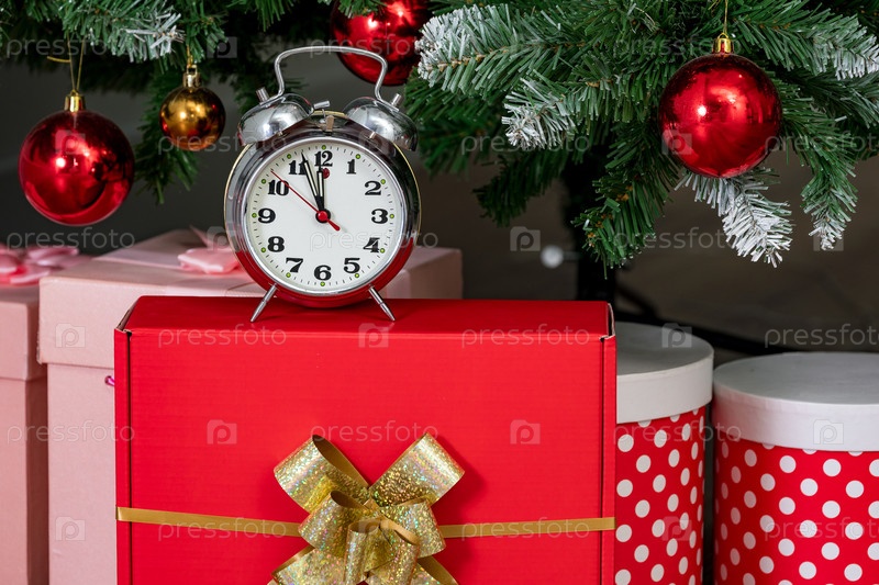 Сигнальные часы и коробки с подарками под рождественской елкой