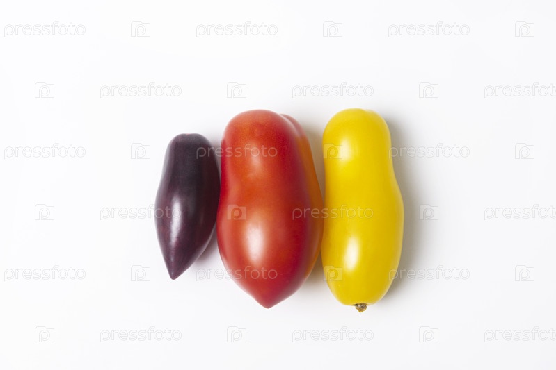 Три помидора разных цветов и сортов в виде слив на белом фоне. Коллекция различных помидоров - красный, желтый и фиолетовый. Красочные органические помидоры на белом фоне. Осенний сбор