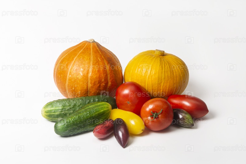 Цветная композиция свежих овощей на белом фоне. Тыква, помидоры и огурцы на белом фоне. Изолированные. Осенний урожай