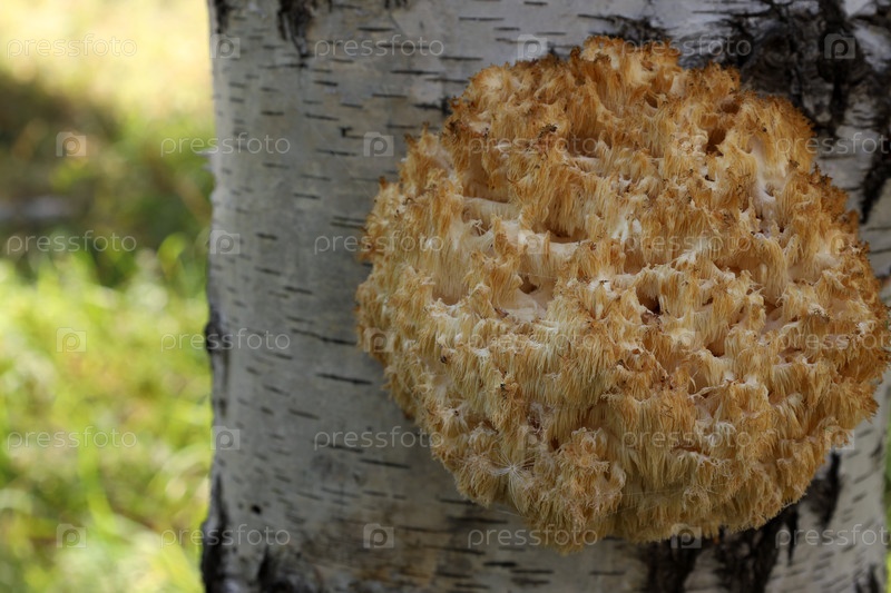 Hericium erinaceus растет в лесу на стволе березы