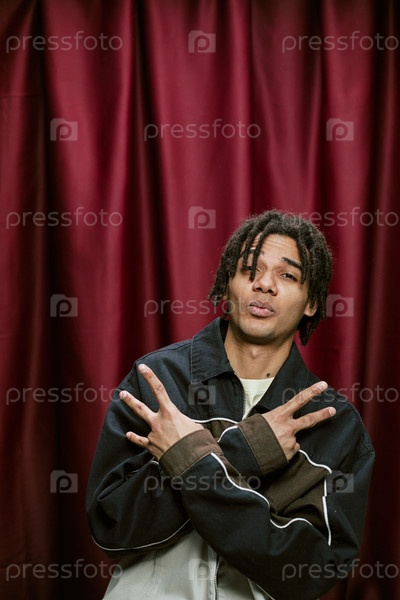 Портрет молодого взрослого чернокожего мужчины, развлекательно позирующего в фотоателье