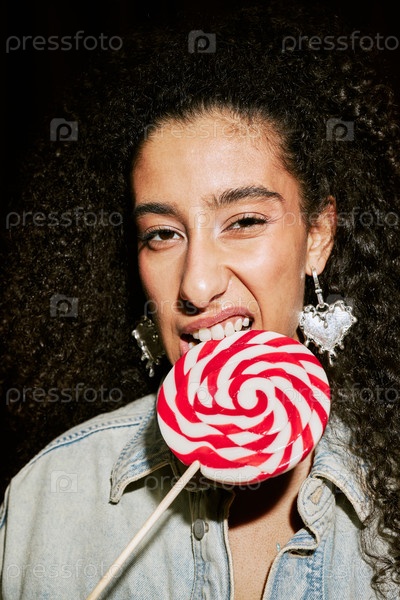 Портрет молодой взрослой женщины с Ближнего Востока, кусающей крутящийся леденец в будке