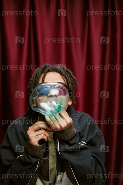Молодой взрослый чернокожий мужчина дует пузырь, сидя внутри фотобуфа