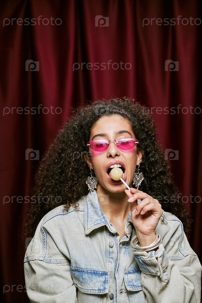 Портрет молодой взрослой чернокожей женщины в солнцезащитных очках, едящей леденец на стенде