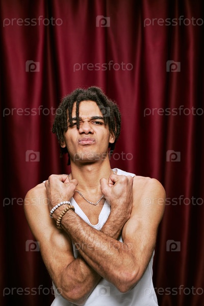Молодой взрослый бирациальный мужчина пересекает руки и делает игривое лицо на фотоштоке