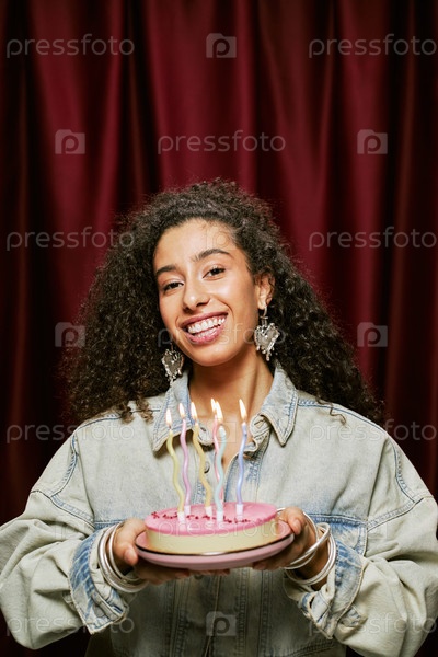 Портрет молодой взрослой мультиэтнической женщины, улыбающейся и держащей в руках рождественский торт