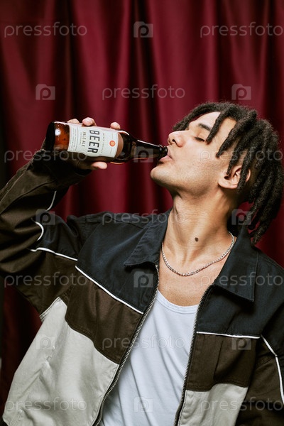 Молодой взрослый мультиэтнический мужчина пьет пиво в фотоателье