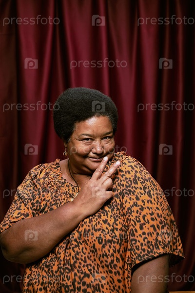 Портрет чернокожей женщины среднего возраста, улыбающейся и жестикулирующей знак мира