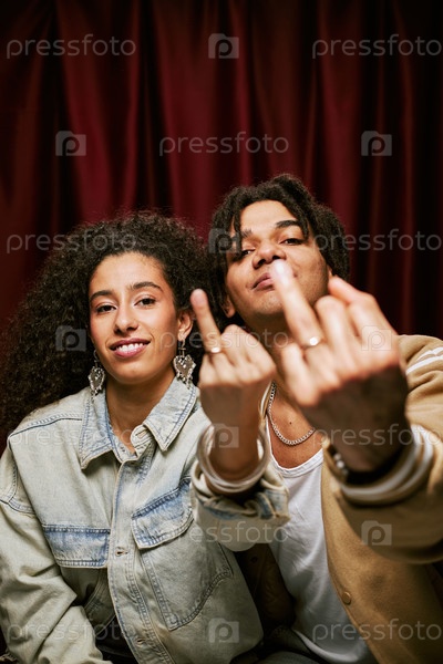 Молодая мультиэтническая пара позирует и жестикулирует кольцевыми пальцами в фотобуфе