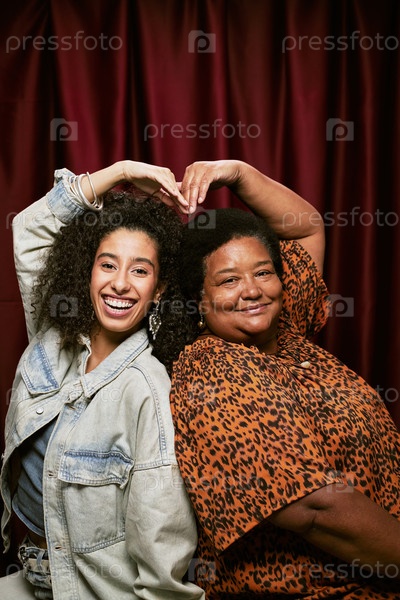 Портрет молодых взрослых мультиэтнических женщин, улыбающихся и делающих сердечный жест
