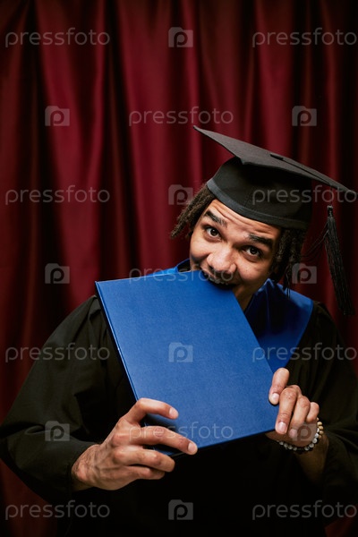 Портрет молодого взрослого чернокожего мужчины, носящего выпускную шапку и кусающего папки с дипломами