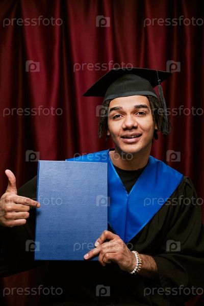 Портрет молодого взрослого чернокожего мужчины, улыбающегося во время вручения диплома в фотобуфе
