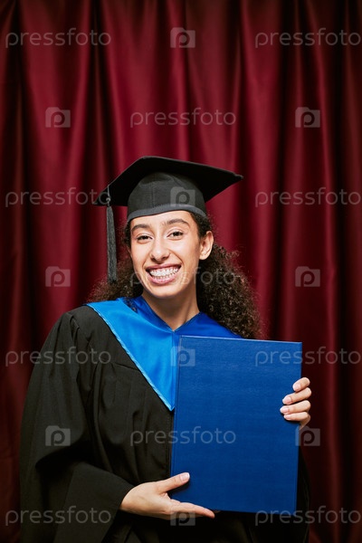 Портрет молодой взрослой испаноязычной женщины, улыбающейся и держащей диплом в фотобуфе