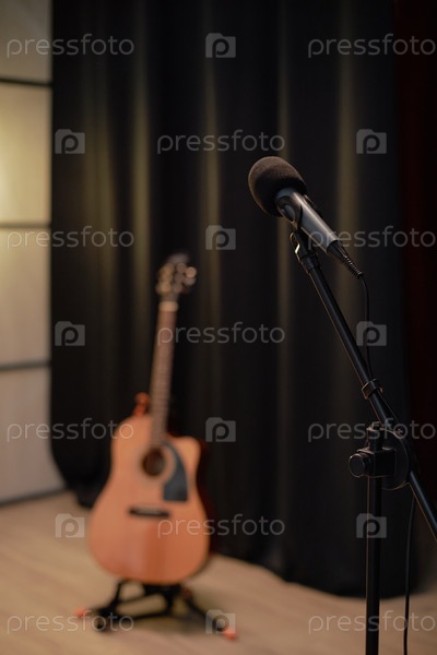 Пустая сцена с микрофоном и акустической гитарой в ожидании выступления талантов