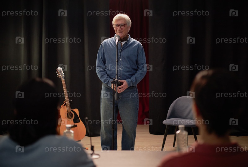 Старший мужчина исполняет стенд-ап комедию во время конкурса талантов